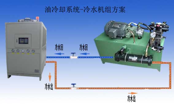 下面的方案就是選用工業(yè)冷水機組來冷卻油溫,工作流程示意圖請參照以下圖片示例: